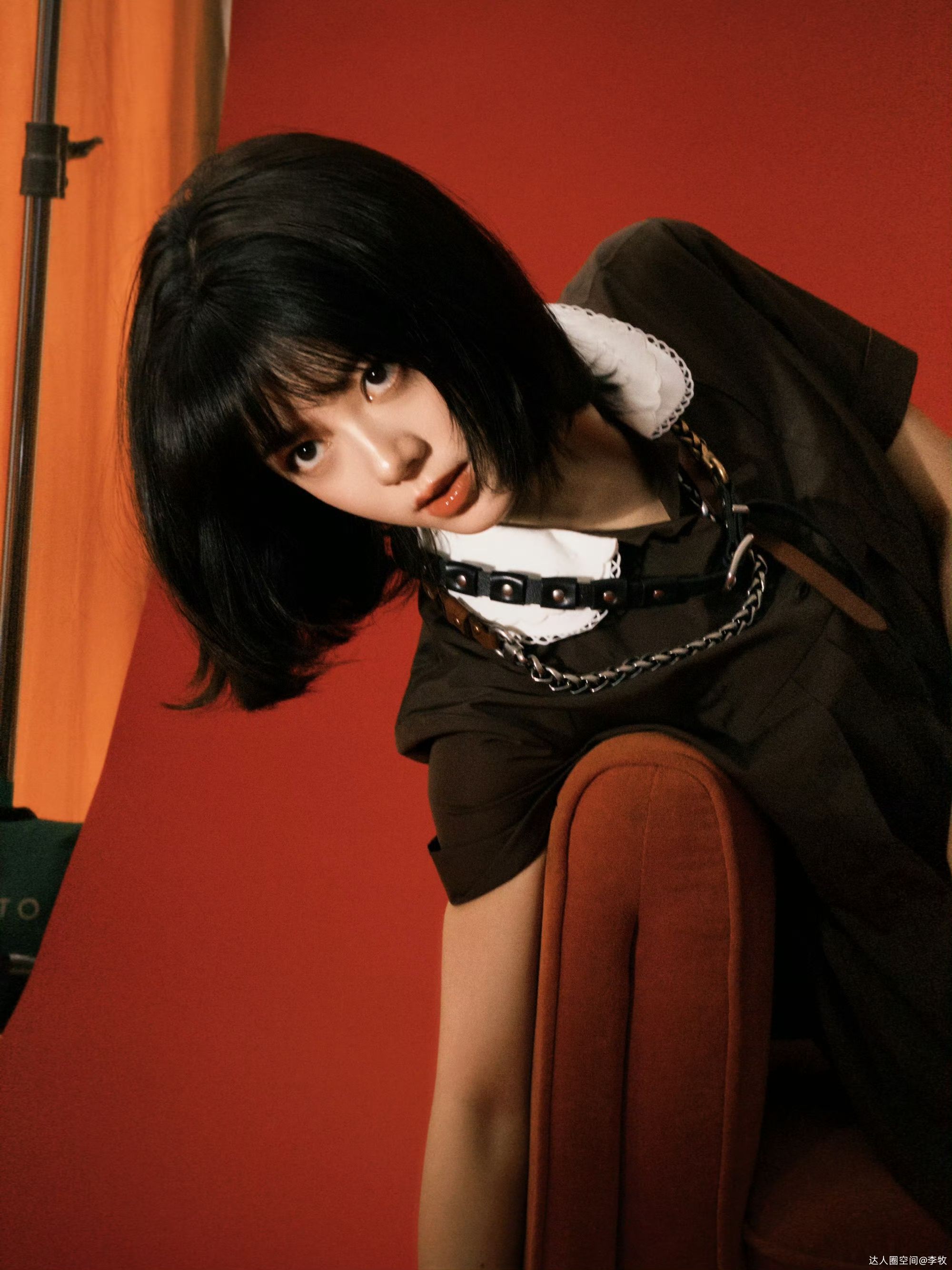 而配饰的选择则彻底打破了甜腻感,完成了风格的反转。金属链条、皮质绑带与铆钉项圈的组合,是整套造型的灵魂:冷硬的金属链与柔软的皮质碰撞,铆钉元素注入朋克感,与娃娃领的甜美形成强烈反差,瞬间将温柔学院风拉向酷飒复古赛道,甜中带飒,张力拉满。